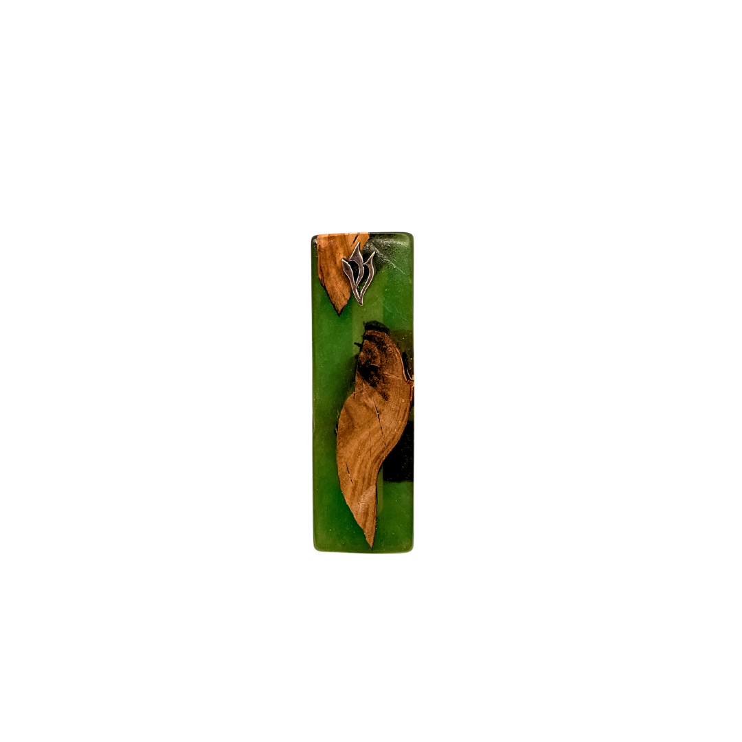 בית מזוזה בעבודת יד המשלב עץ טבעי ואפוקסי בגוון ייחודי – כל פריט הוא יצירה חד-פעמית עם נוכחות.